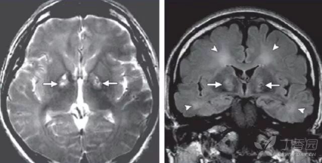 (1)肝豆状核变性脑病 主要改变是铜在脑实质内沉积引起的海绵状变性和胶质增生,以豆状核最为明显,亦可累及尾状核、丘脑、脑干及大脑皮层,病灶为双侧对称性分布。