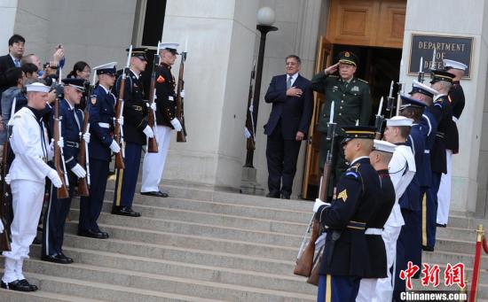 美国国防部长帕内塔7日在五角大楼举行欢迎仪式欢迎中国国防部长梁光烈访问美国,这是中国国防部长9年来首次正式访美。中新社发吴庆才摄