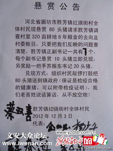 在一则网贴中,胜芳镇某村街几名村民称:10年前,该村街负责人未经村民同意,将村里310亩承包地出租,村民至今没有拿到租赁费用。村民怀疑土地租赁手续有问题,租赁金被干部侵吞,于是四处反映,但始终没能引起相关部门及领导的重视。村民认为,久无回音主要原因是没有给领导送礼,经商量,几位代表一致同意以悬赏方式,请求镇领导查处村街负责人。由于这几个村民主张权益的方式非常特殊,此网贴引起了广泛关注。