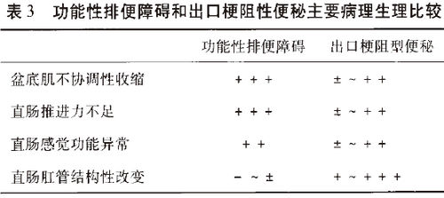 在临床实际工作中,有相当部分慢性便秘患者被诊断为FC,但没有接受结肠和肛门直肠功能评估检查,其FC诊断属于“广义的功能性便秘’范畴,而明确有结肠传输延缓的FC属于“狭义的功能性便秘”,即慢传输型便秘。FDD与出口梗阻性便秘也并非同义词,后者包括了除FDD以外,肛门直肠和盆底形态改变所引起的便秘,如直肠前突、直肠内套叠,这些患者可以伴有或不伴有明显的肛门直肠排便功能的异常,也就是说引起“出口梗阻”的原因可以是功能性的(不协调性排便),也可以是形态改变所致(如直肠前突),或二者同时存在。表3可以帮助读者比较理解以上的内容。因此,不能强求以FDD取代出口梗阻性便秘一词。