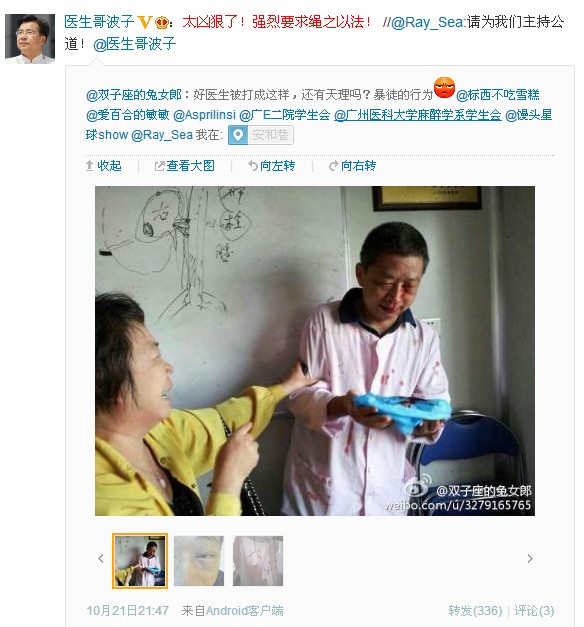 10月21日21时47分,广东省卫生厅副厅长廖新波的网上认证账号转发微博:“太凶狠了!强烈要求绳之以法!”