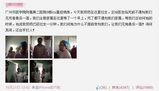 有网友称,21日上午的纠纷,起因是“患者家属要求把已死亡患者带回家遭拒,ICU医生依法无权同意”,随后患者家属对ICU医生进行群殴,其中广医二院熊姓医生遭到毒打。根据网友提供的图片,图中这位“熊医生”左眼红肿,眼袋开裂,同时鼻孔大量流血。 不久后,一份“中心ICU医生请愿书”在网上传开,这份“请愿书”表示,有三名医生均“遭到患者家属集体围殴”。其中熊医生“背部及全身多处软组织损伤,左眼部肿胀出血,左侧口鼻大量出血,肾挫伤、脾血肿。”另有一名医师“头部、下颌被硬物重击”。 该“请愿书”称,家属殴打医生之后数小时,仍聚集在ICU门口。 患者家属:无良医生医死人,还动手打人 而在21日中午12时42分,一网友发帖称,“广州市医学院附属第二医院6楼ICU重症病房,今天我奶奶在这里过身,主治医生临死前不通知我们见死者最后一面,我们全部家属在这里等了一个早上,死了都不通知我们家属,等我们主动问他的时候,他说我奶奶已经去世一分钟,我们问他为什么不提前告知我们,让我们见她最后一面!询问期间,还出手打人!”