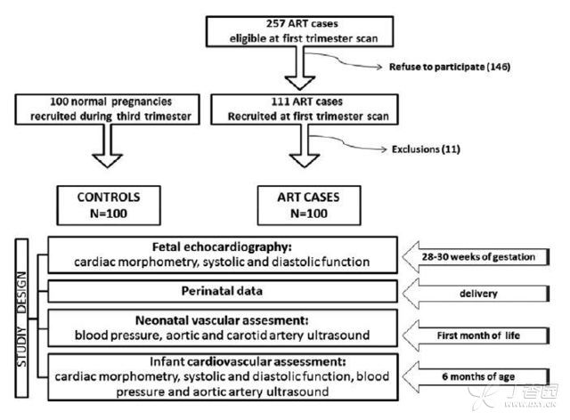 图为研究中前瞻性队列研究的具体流程 研究要点 辅助生育技术与婴儿期出现的心血管及心室重构相关。 该研究为前瞻性队列研究,研究人员选取100例ART胎儿及100例正常妊娠所得的对照组胎儿。研究采用心脏超声检查,胎儿胎盘多普勒技术及颈动脉和主动脉超声等方式获得相关数据,并对同一样本分别测量胎儿期及婴儿期的各项指标。 研究结果显示,ART胎儿期就表现出心血管重构的征象,其中包括心室壁增厚的球形心,长轴功能下降,舒张功能受损及心房扩张。而且,ART组婴儿的大多数心脏变化呈持续性,婴儿同时伴有主动脉内膜中层变厚及血压升高。 值得注意的是,研究者指出由于该试验存在多种混杂因素,所以以上数据并不能确认ART直接造成了上述心血管系统变化。其中还需要考虑子宫内生长受限及致不孕等因素。 最后,研究者认为该试验可以说明ART妊娠后在婴儿期即表现有心脏和血管重塑,而这种变化在出生后依然持续存在——这为早期诊断及干预提供了机会。而一些混杂因素在其中的机制亦有待阐明。 研究背景: 辅助生育技术一般为体外受精或胞浆内单精子注射,可帮助生育障碍的夫妇进行分娩。这项技术带来的新生儿占发达国家1% 到4%的生育数。虽然ART技术本身比较安全,但是研究者一直在关注ART与较差分娩结局的潜在相关性。现已有证据表明ART与不良围产期结果及先天性畸形相关。尽管如此,我们不能否认ART相关的危险因素与继发于以生殖病理为基础的病变的相关性。在这种情况下,既往研究指出ART与长期的心脏病变相关。Ceelen等人首先提出ART受孕后造成童年晚期出现血压升高。而近期,另一系研究指出ART受孕后所得个体在12岁出现全是及肺部血管功能障碍。 过去有研究指出心血管重构与低出生体重有关,而低出生体重被认为是“胎儿程序化”的一种表现。然而,我们不清楚胎儿期是否也出现了心脏重塑。而且,与低出生体重相关的胎儿期心血管重新编程已证实伴有心肌重塑。尽管如此,ART与心脏结构及功能重构的潜在关系被为得到研究。而此项研究能够使我们进一步认识ART对于心血管系统的影响并制定预防策略。因此,我们选取100例ART胎儿及100例正常妊娠所得的对照组胎儿进行了前瞻性队列研究,并假设ART与出生后的心血管及心室重塑相关且可以在胎儿期观察到这些变化。 来源:丁香园 |