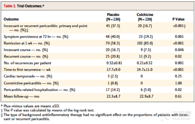 研究要点: 秋水仙碱对于急性心包炎的治疗是有效的。 该研究为一项多中心双盲对照试验,共有240位患者参与。在为期三个月的时间内,患有心包炎的符合条件的成年人被随机分配,在接受传统的阿司匹林或布洛芬抗炎治疗之外,同时给予秋水仙碱(体重>70kg者0.5mg每日两次,体重≤70kg者0.5mg每日一次,持续三个月)或安慰剂干预。主要研究终点为持续性或复发性的心包炎。 研究结果表明,秋水仙碱组的120位患者中有20位(16.70%)出现主要指标,安慰剂组的120位患者中有45位(37.5%)出现主要指标。秋水仙碱在72小时后减少了症状持续的比例(P=0.001),每位患者的复发次数(P=0.001)以及住院率(P=0.02)。同时,秋水仙碱在一周后提高了缓解率(P<0.001)。 该研究发现,在急性心包炎患者中,传统抗炎治疗基础上加用秋水仙碱,明显的降低了持续性和复发性心包炎的比例,减少了心包炎的复发例数,并且延长了复发时间。 研究背景: 秋水仙碱是一种生物碱,能抑制有丝分裂,破坏纺锤体,使染色体停滞在分裂中期。在秋水仙碱有丝分裂中,染色体虽然纵裂,但细胞不分裂,不能形成两个子细胞,因而使染色体加倍。几个世纪以来,秋水仙碱已被应用于治疗和预防痛风发作,近来又被建议用于治疗和预防家族性地中海热患者的浆膜炎以及复发性心包炎。 来自非随机试验的初始数据也支持秋水仙碱在治疗和预防急性心包炎中的应用。在一项被称为秋水仙碱与急性心包炎(COPE)的单中心开放性随机试验中,在传统的阿司匹林或布洛芬抗炎治疗基础上加用秋水仙碱,使急性心包炎首次发作后的再发率减半。 在2005年,一项称为关于秋水仙碱与复发性心包炎的研究 (CORE) 的开放性随机试验揭示了秋水仙碱在复发性心包炎治疗中的作用。随后又有一项称为关于秋水仙碱与复发性心包炎的研究(CORP)的多中心双盲试验和随后的meta分析支持秋水仙碱在此类患者中的应用。然而,这些试验并没有提出秋水仙碱在首发的急性心包炎中的应用。 因此,研究者进行了这项研究,旨在评估秋水仙碱在治疗心包炎首次发作和预防复发中的疗效和安全性。 信源地址:http://www.nejm.org/doi/full/10.1056/NEJMoa1208536 |