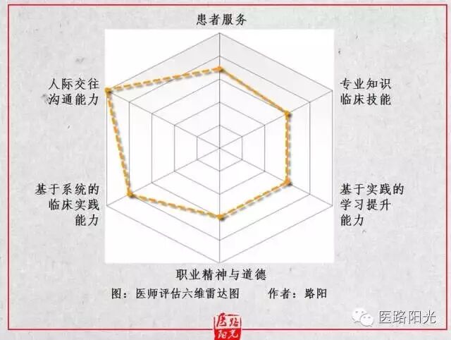 医生的五种角色 服务总导演:从预约、门诊、检查、住院、手术、出院、随访等一系列服务,都是由医生在主导。 主要决策者:不论是门诊还是住院,医生是诊疗方案的主要制订者和决策者; 服务推动者:不论是护士还是技师,都在执行的医生的医嘱; 关键责任人:医师的知识、技术、沟通能力和领导力直接关系到疗效和质量; 关系缔造者:医生是医患关系缔造者,是与患者建立信任的关键界面。 如何全面评估医生:六维雷达图