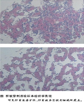 入院后的进一步检查 常规检查及影像学检查 患者血常规检查结果显示,WBC为6.14×109/L,Hb为72 g/L,红细胞平均体积(MCV)为87.4 fL,平均红细胞血红蛋白 含量(MCH)为 29.1 pg,平均红细胞血红蛋白浓度(MCHC)为333 g/L,PLT为109×109/L,网织红细胞(RET)比例 为 1.75%。 凝血分析结果显示,PT为15.4秒,PTA为59.54%,INR为1.34,APTT为 39.2秒。 生化检查的结果显示,ALT为18 U/L,AST为49 U/L,γ-GT为104 U/L,乳酸脱氢酶(LDH)为355 U/L,ALB 为34.1 g/L,TBil为26.6 μmol/L,DBil为14.9 μmol/L。 电解质检查显示,血钾为4.05 mmol/L,血钠为 134.8 mmol/L。二氧化碳为 20.6 mmol/L。 肿瘤常规检查显示,癌抗原(CA)125 为53.69 U/ml,升高,甲胎蛋白(AFP)、癌胚抗原(CEA)、CA19-9、细胞角蛋白片段21-1(CYFRA21-1)、神经元特异性烯醇化酶(NSE)及CA15-3均无异常。 超声心动检查的结果显示,主动脉钙化,主动脉内流速增高,左室舒张功能减退。 腹部超声检查的结果显示,肝脏形态异常,肝右叶最大斜径17.4 cm,左肝剑下径7 cm,肝内弥漫分布多发实性高回声及等回声团块,最大4.7 cm×2.8 cm。诊断为弥漫性肝肿大,肝内多发实性占位性病变。 肝弹性测定结果为67.8 KPa。 肝组织学检查结果 入院当天,在 超声引导下对患者进行肝组织活检。病理结果显示(肝脏穿刺活检标本),送检肝组织4条,其中3条组织肝窦显著扩张,肝窦被覆异型梭形细胞,另1条组织中肝组织结构破坏,可见梭形细胞肿瘤成分,其间可见不规则的裂隙,细胞异型明显(图)。 结合免疫组化染色结果显示,角蛋白(CK)阴性,肝细胞(Hepatocyte)(肝细胞+,肿瘤细胞-),波形蛋白(Vimentin)阳性 (++),CD31阳性(++),CD34阳性(++),突触蛋白(Syn)阴性,嗜铬蛋白A(CgA)阴性,CD56阴性,LCA为散在少数细胞 (+),细胞增殖相关抗原Ki-67(+,50%)。 上述检查结果符合符合血管来源性的恶性肿瘤,因此,肝血管肉瘤的可能性大。