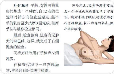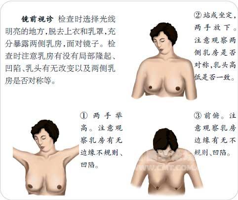 乳房肿块是女性乳腺疾病中最常见的临床表现。一般只要妇女自己或医生触摸到乳房有块状物或突起就可称为乳房肿块,乳房的炎症、肿瘤、增生性疾病及发育异常均可出现乳房肿块。乳房肿块可分为生理性肿块和病理性肿块,女性在月经来潮前由于激素的刺激,可出现生理性肿块,其大小会随月经周期的变化而变化,而病理性肿块的大小则不随月经周期改变。 了解乳房肿块 临床分类及表现 乳房肿块的诊断,首先必须明确“乳房肿块”是正常结构还是异常结构,如果是异常结构则需要鉴别其良、恶性。 急性乳腺炎 多见于哺乳期妇女,表现为乳房局部或弥漫性疼痛、红肿及皮温升高,腋下可触及肿大淋巴结。 乳腺囊性增生病 典型表现为乳房的胀痛和肿块,且与月经周期相关,月经来潮前疼痛加剧,月经来潮后疼痛减轻或消失。 乳腺纤维瘤 乳腺的一种良性肿瘤,好发于青年女性,可单发或多发,多为体检中发现或无意中自己扪及。 乳腺癌 最常见的乳腺恶性肿瘤,临床表现为单侧乳房的无痛性肿块,肿块形态不规则、质地硬,与周围组织界限不清而无法推动。 乳管内乳头状瘤 乳腺的一种良性肿瘤,但有6%~8%的恶变率。好发于中年女性,通常因乳头溢液就诊而发现,溢液可为血性或黄色液体。肿块一般比较小,不能触及。 副乳 一种最常见的先天性乳腺发育异常。在乳房的外上象限近腋部可触及柔软肿块,平时无特殊感觉,在月经期、妊娠或哺乳时可出现胀痛不适。 病史询问 应了解患者的月经史、生育史、哺乳情况、既往乳腺疾病史、乳腺癌家族史等。同时应了解有无疼痛、乳头溢液等伴随症状。应详细询问肿块的情况,如出现时间、数量和生长速度等。 体格检查 体检时应注意肿块的位置、数量及大小,肿块的质地和形状,肿块与皮肤及周围组织的关系,同时还应注意有无腋窝淋巴结肿大。良性肿瘤形态规则、表面光滑、边界清楚、活动度大。 辅助检查 最简便易行的为超声检查,超声检查无损伤,准确率高,对年龄<35岁或乳腺组织较致密的女性患者来说,超声检查是首选的方法。乳腺钼靶检查是筛查乳腺癌很好的工具。 治疗 乳房肿块主要为病因治疗。先天性发育异常一般不需处理,急性乳腺炎应选用广谱抗生素,暂停哺乳,排净乳液,保持乳腺通畅,局部可热敷;已形成脓肿者应转上级医院穿刺引流。乳腺囊性增生患者告知其定期随访复查。 转诊指征 急性乳腺炎经抗生素治疗无效或已形成脓肿者应及时转诊;当怀疑为乳腺恶性肿瘤时,应立即转至上级医院手术治疗;乳房肿块定期随访过程中逐渐增大者,应转上级医院手术治疗。 乳腺自我检查方法 乳腺自我检查是指女性自己对乳房的定期或不定期的自我检查,最好能每月1次。自我检查可及时发现乳房的异常情况,以便及时就诊,从而可以发现一些乳腺疾病,特别是可以早期发现乳腺癌等。 有报告指出,乳腺肿瘤发现时平均大小与乳腺自我检查有关,每月1次乳腺自我检查的患者乳腺癌发现时肿块平均直径为2 cm,而没有乳腺自我检查的患者乳腺癌发现时肿块平均直径为4 cm。 社区医生应教育社区女性养成乳腺自我检查的好习惯,教会女性乳腺自我检查的方法,做到对乳房的正确自我检查,这样才能早发现乳腺疾病,早期治疗。 检查时机 乳房自我检查每月1次。 有月经的妇女 最佳时间应在每月月经来潮后7~10天检查,此时乳房较松软,易于发现病变。 已停经的妇女 每月固定任何一天检查。 检查方法